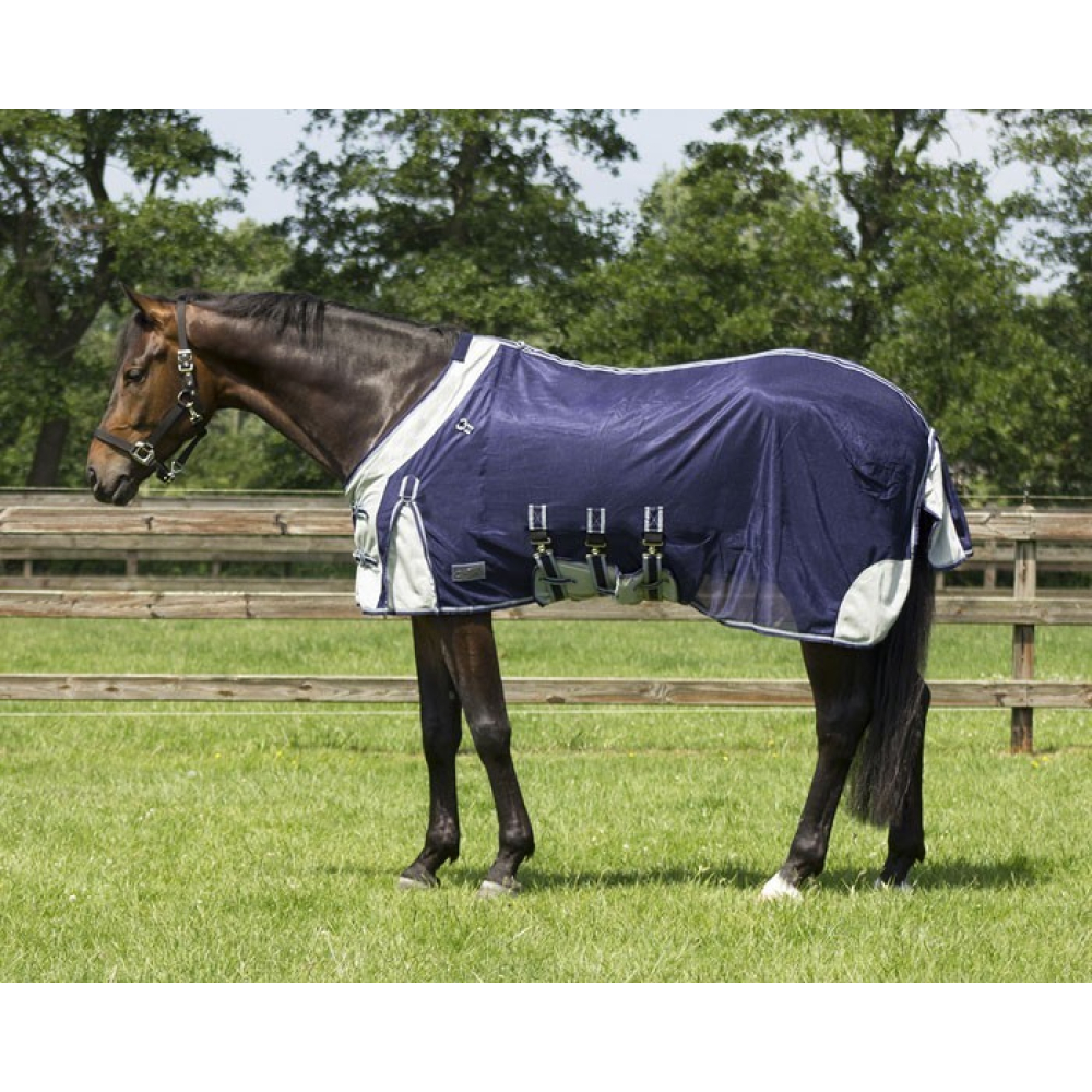 In de zomermaanden kunnen paarden veel last hebben van vliegen, dazen, muggen en andere vervelende insecten. Om je paard hier tegen te beschermen hebben wij diverse vliegendekens, zoals de vliegendeken met nek en hoed. Deze deken heeft een losse hals en hoed, waardoor je deze kunt afnemen als de muggen en insecten minder actief zijn. De deken heeft een buikflap die erg mooi aansluit en dubbel vast komt met klittenband en singels, hierdoor wordt verschuiving voorkomen.