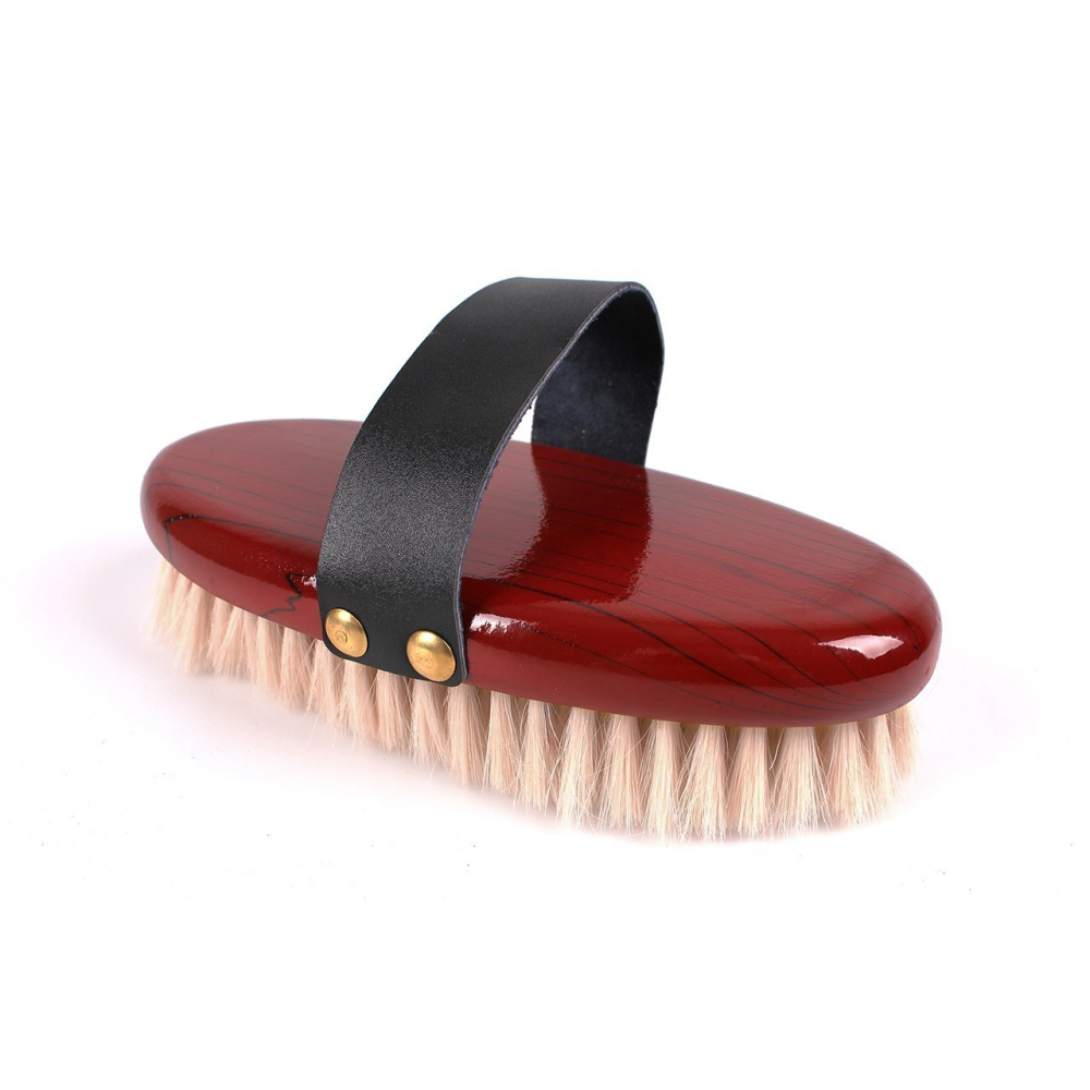 Zachte borstel met extra zacht geitenhaar. Met houten handvat voorzien van een een band van imitatieleer. Het geitenhaar laat de vacht van het paard glanzen.